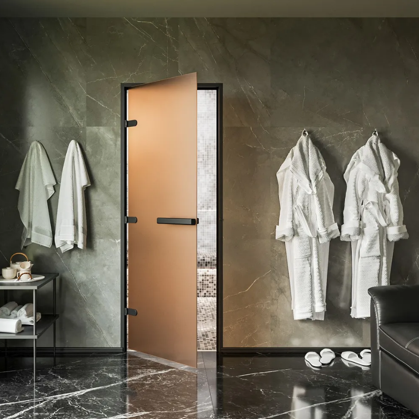 Дверь для хамам и сауны Gratec Diana Black Premium, чёрные короб и фурнитура, бронза Matelux матовое закаленное стекло, магнитный уплотнитель