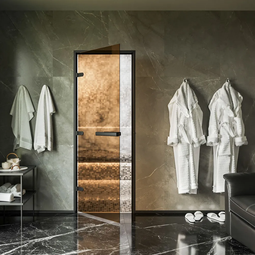 Дверь для хамам и сауны Gratec Estri Black Premium, чёрные короб и фурнитура, бронза прозрачное закаленное стекло 8 мм