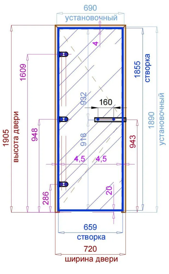 Установочный размер проёма: высота 1890 мм, ширина 690 мм