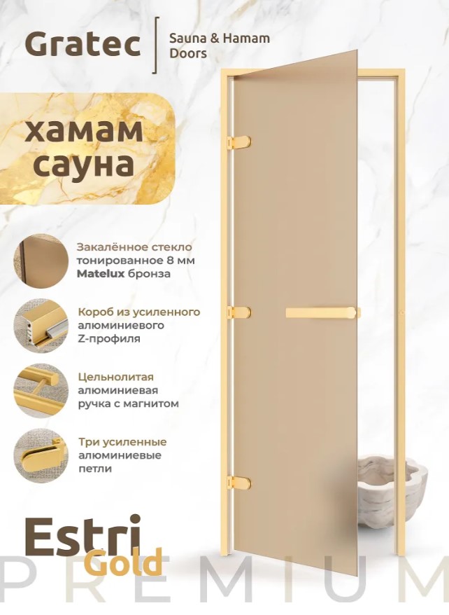 Дверь для хамам и сауны Gratec Estri Gold Matte, цвет матовое золото короб и фурнитура, бронза матовое закаленное стекло 8 мм