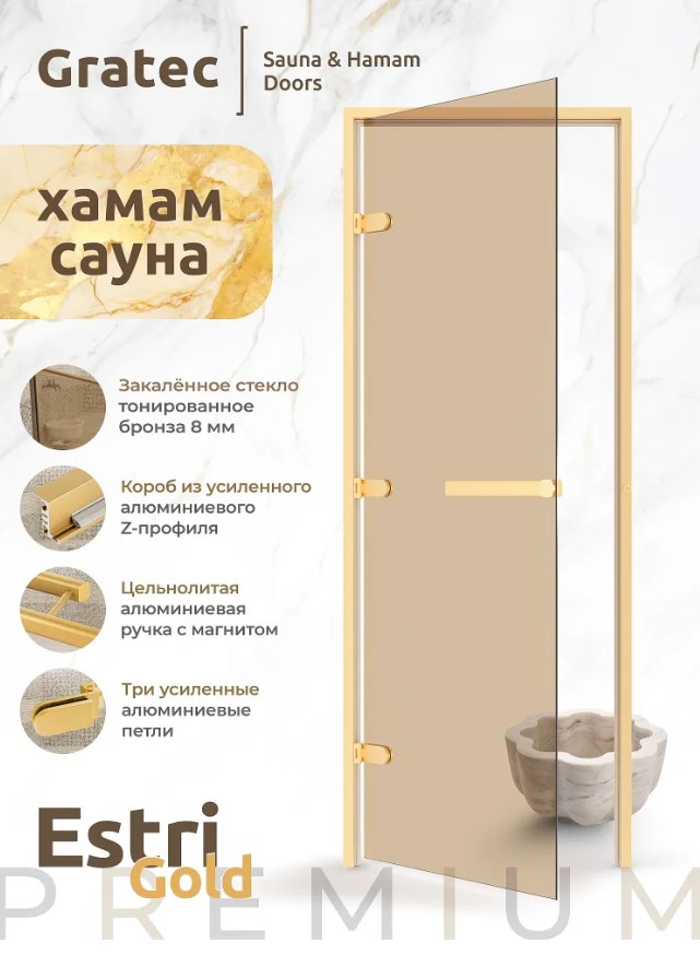Дверь для хамам и сауны Gratec Estri Gold Matte, цвет матовое золото короб и фурнитура, бронза прозрачное закаленное стекло 8 мм