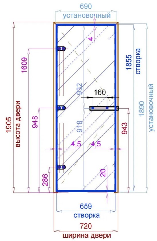 Установочный размер проёма: высота 1890 мм, ширина 690 мм