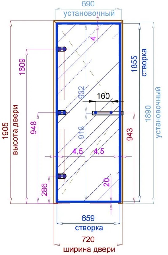 Установочный размер проёма: высота 1890 мм, ширина 690 мм