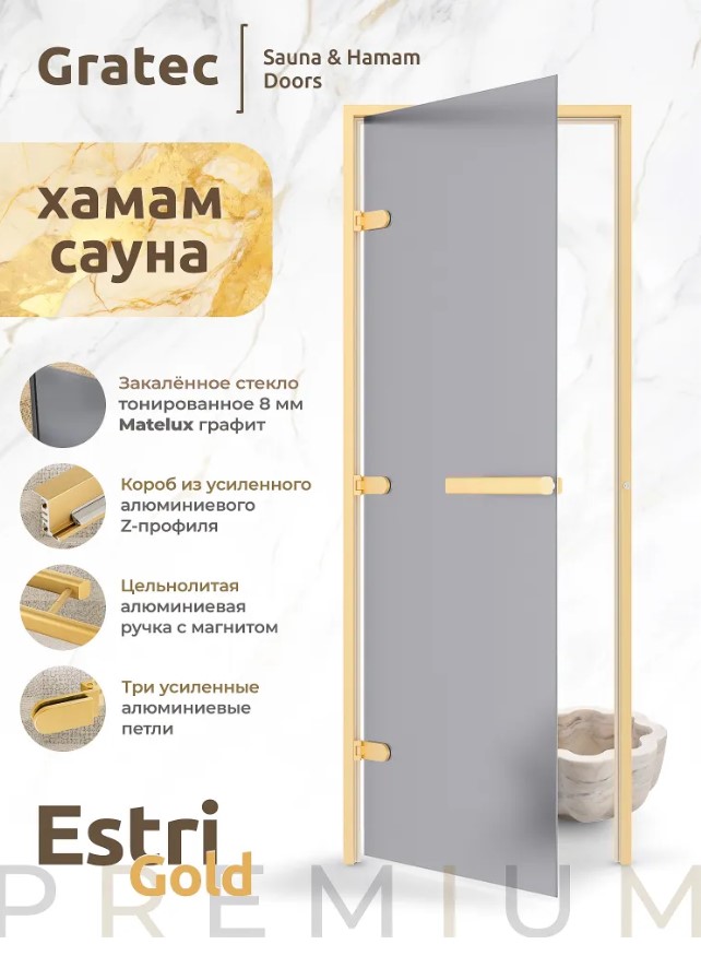 Дверь для хамам и сауны Gratec Estri Gold Matte, цвет матовое золото короб и фурнитура, серое Matelux матовое закаленное стекло 8 мм