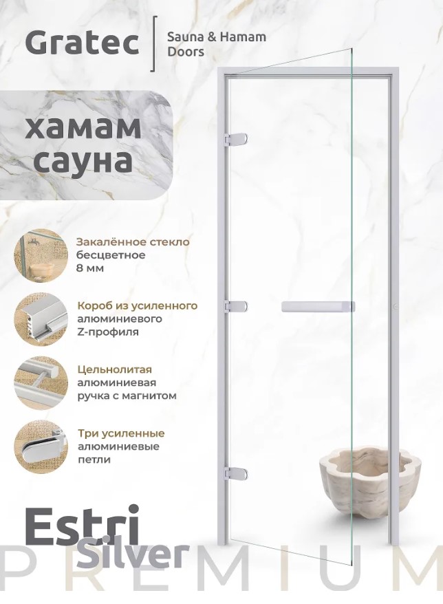 Дверь для хамам и сауны Gratec Estri Premium, прозрачное закаленное стекло 8 мм
