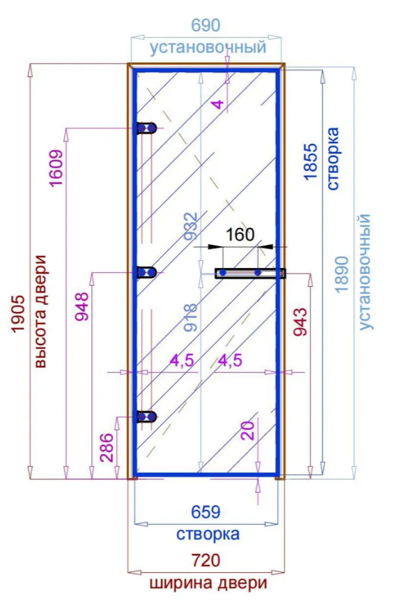 Установочный размер проёма: высота 1890 мм, ширина 690 мм
