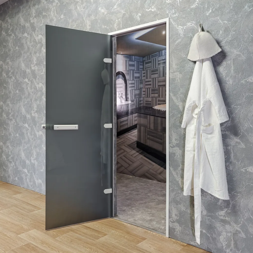 Дверь для бани и сауны Gratec Teia Premium 2025, короб из массива бука, серое матовое Matelux закаленное стекло 8 мм