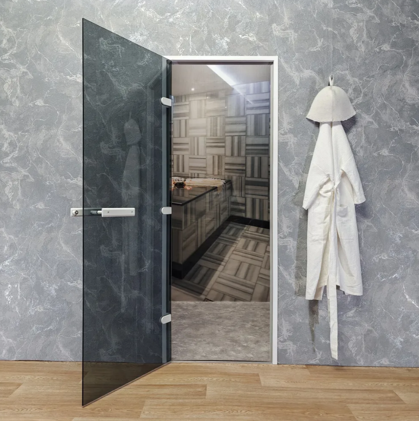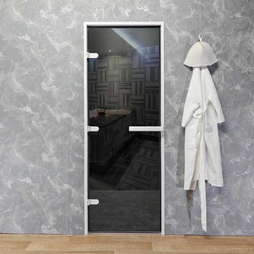 Дверь для хамам и сауны Gratec Estri White Premium, белый короб и фурнитура, серое прозрачное закаленное стекло 8 мм фото 6