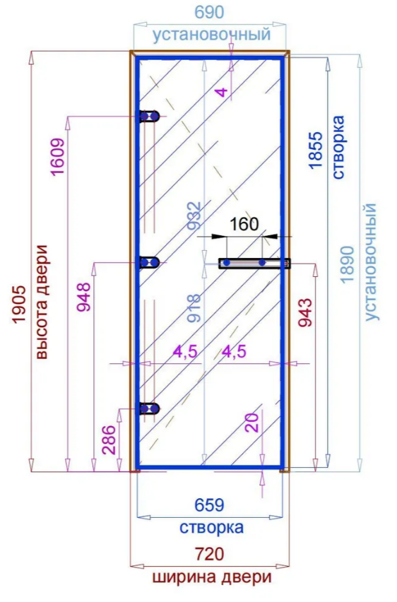 Установочный размер проёма: высота 1890 мм, ширина 690 мм