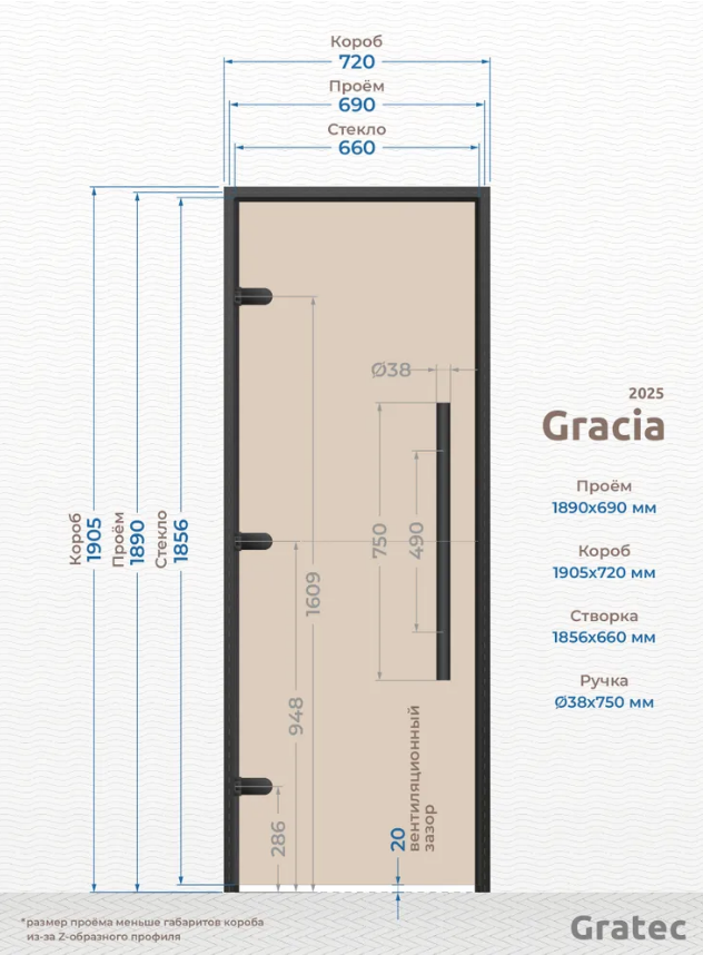 Дверь для бани и сауны Gratec Teia Premium 2025, короб из массива бука, серое матовое Matelux закаленное стекло 8 мм