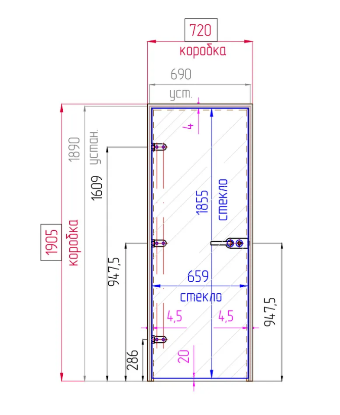 Установочный размер проёма: высота 1890 мм, ширина 690 мм