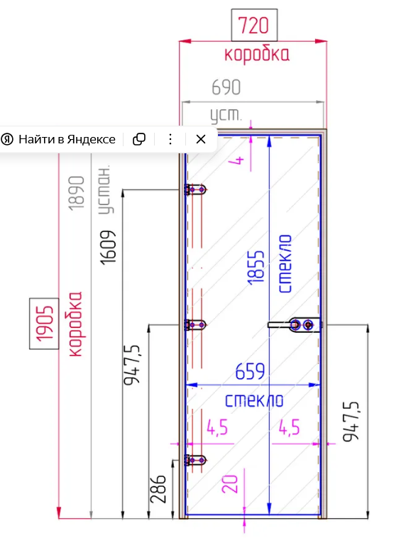 Размеры стеклянной створки: высота 1855 мм, ширина 659 мм, толщина стекла 8 мм