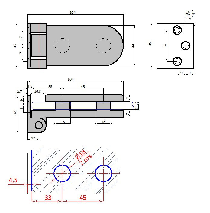 Петля торцевая вертикальная для стеклянных дверей, толщиной 8-10 мм, крепления в алюминиевую и деревянную коробку с притвором.
