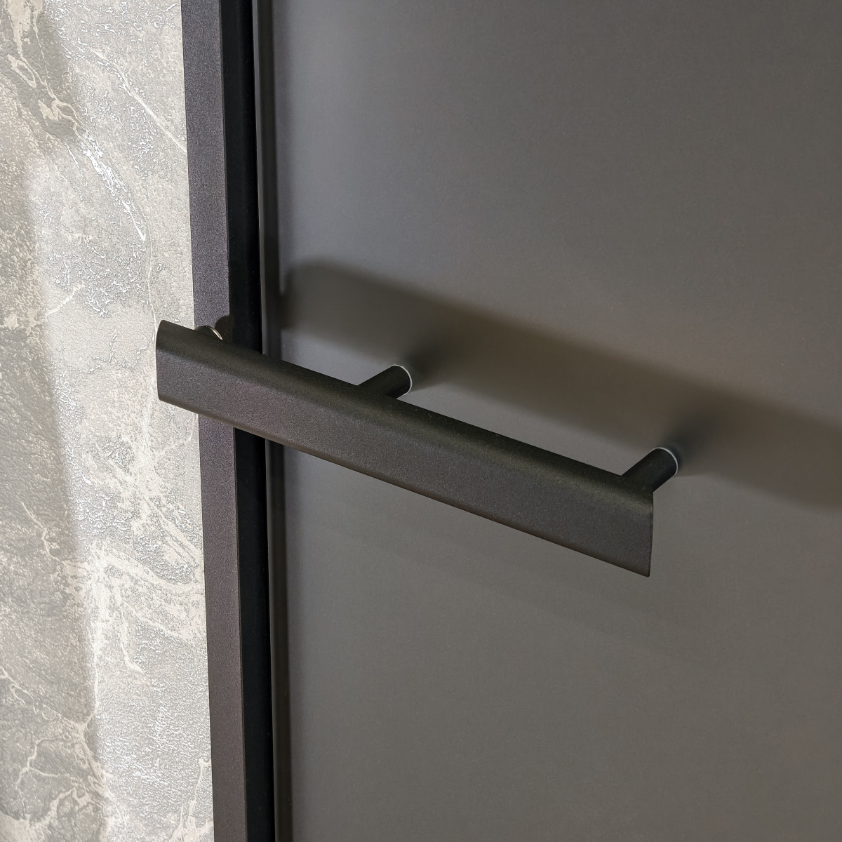 Дверь для бани и сауны Gratec Vega Black Premium, короб и ручка из массива бука Black Satin, магнитный уплотнитель, серое матовое Matelux закаленное стекло 8 мм