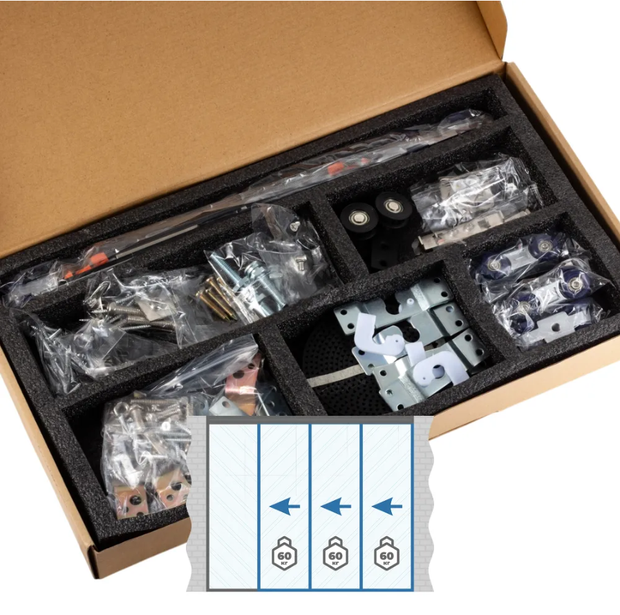 Данный комплект состоит из одной глухой неподвижной створки и трех откатных телескопических створок, синхронно открывающихся и закрывающихся. В данный комплект входит двухсторонний доводчик с функцией плавного закрывания - открывания створок.