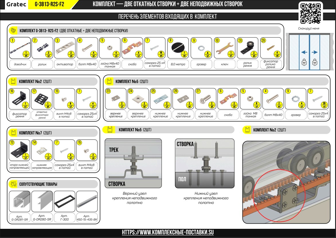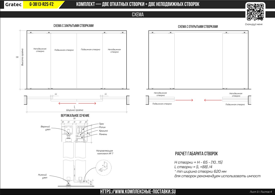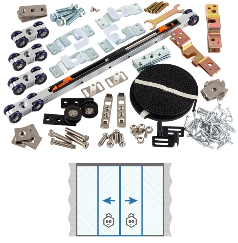 Данный комплект состоит их двух глухих неподвижных створок и двух откатных створок синхронно открывающиеся в разные стороны. В данный комплект входит двухсторонний доводчик плавного закрывания - открывания.
