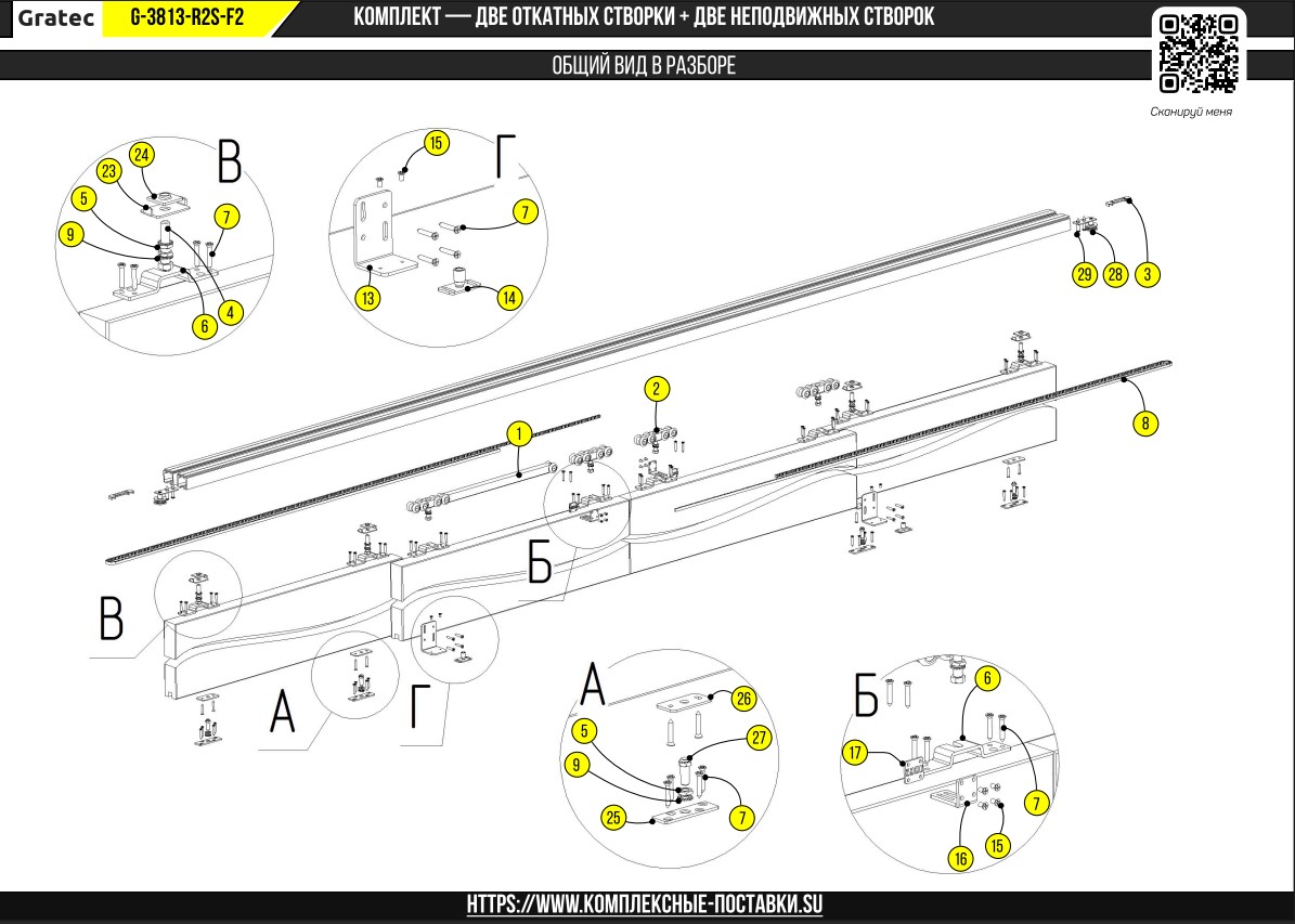 Раздвижная система для дверей до 60+60 кг, две синхронно-откатные створки с доводчиком и две фиксированные арт. G-3813-R2S-F2