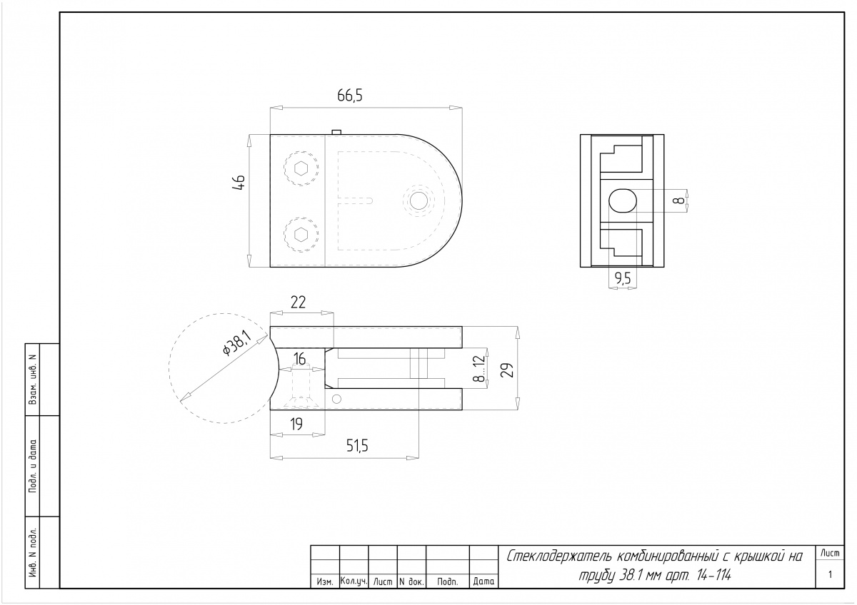 Стеклодержатель комбинированный с крышкой 66х46х29 на трубу 38.1мм арт. 14-114