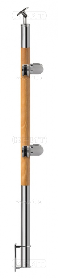 Комбинированная угловая стойка с креплением в косоур, диаметром 38 мм из бука и нержавеющей стали с двумя стеклодержателями