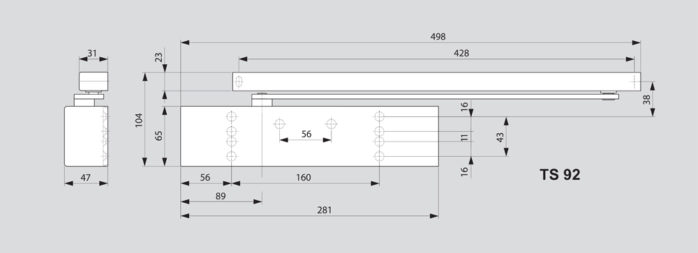 Универсальная конструкция, плавная регулировка усилия пружины, удобная регулировка скорости закрывания и захлопывания двери, привлекательный дизайн, позволяют характеризовать TS-92 как идеальное решение для установки на деревянные, металлические и противопожарные двери.